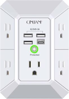 Keep all your devices charged and protected with the QINLIANF 5-outlet wall charger and surge protector. Featuring 4 USB ports and 5 spaced outlets, it provides convenient charging for smartphones, tablets, laptops, and other electronics. The 1680J surge protection safeguards your devices from power spikes, making it ideal for home, office, or travel use.